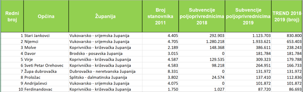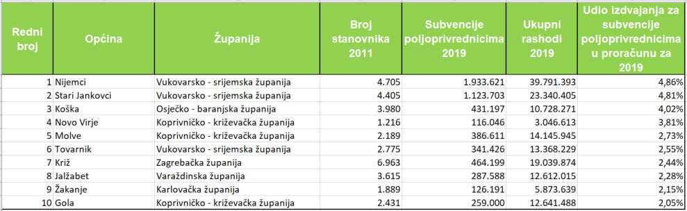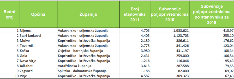 Općina Nijemci izdvojila je po glavi stanovnika za subvencije poljoprivrednicima u 2019. godini 410,97 kuna, Stari Jankovci 255,10 kuna, Molve 176,62 kune, Općina Tovarnik 123,04, Koška 108,34 kune, Gola 106,54, Novo Vrije 95,43 kune, Jalžabet 79,55 kuna, Općina Zagvozd 69,02 kune i Općina Virje 67,43 kune.