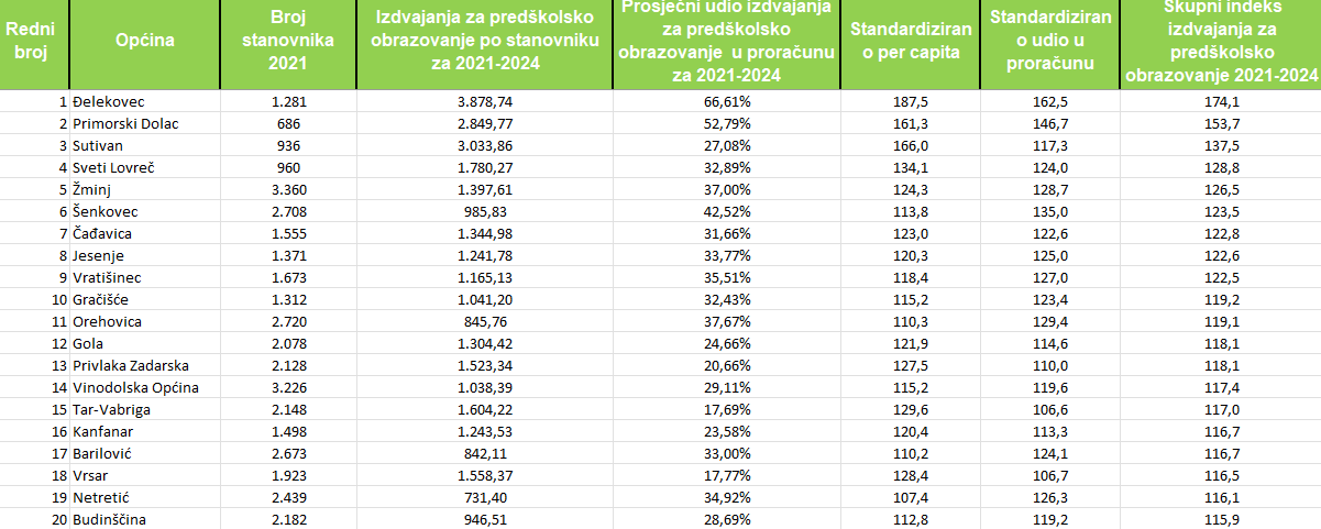 Općina koja prednjači u ovoj kategoriji prema kompozitnom indeksu ulaganja za predškolski odgoj je Đelekovec iz Koprivničko-križevačke županije, koja s indeksom 174,1 zauzima lidersku poziciju, u četiri godine uloživši blizu 5 milijuna eura (4.968.663), što znači 3.878 eura po stanovniku (1.281), ali i usmjeravajući prosječno na vrtićku skrb impresivnih 66,61 posto ukupnog proračuna. Drugi na listi je Primorski Dolac, sa 2.849 eura po stanovniku i 52,79 posto udjela u ukupnim izdvajanjima iz proračuna, uz skupni indeks 153,7, dok je treće mjesto s indeksom 137,5 zauzela općina Sutivan na otoku Braču, čiji su proračunski udjeli za predškolski odgoj iznosili 27,08 posto, no uz popriličnih 3.033,86 eura ulaganja ‘per capita’.
