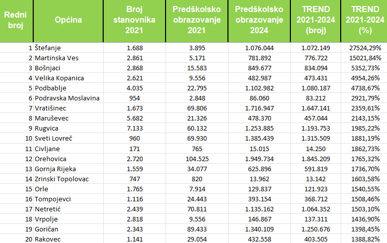 Kako smo već i spomenuli, u aktualnom mandatnom razdoblju uočavamo i trend značajnog rasta ulaganja, osobito u onim općinama koje su se u 2021. godini nalazile na nižim pozicijama. Najveći – rekordan- 27.524, 29 (!) postotno povećanje izdvajanja u predškolski odgoj zabilježila je općina Štefanje, koja je s inicijalnih 3.895 eura u 2021. skočila na preko 1 milijun eura (1.076.044) u 2024. godini, a sličan trend rasta bilježi i općina Martinska Ves, čija su izdvajanja porasla s 5.171 euro na 781.892 eura, što predstavlja 15.021,84 posto povećanja. Značajan porast također je zabilježen u općinama Bošnjaci, Velika Kopanica, Podbablje, Podravska Moslavina, Vratišanec, Maruševec, Rugvica i Sveti Lovreč, gdje su izdvajanja višestruko povećana, pa je osam prvih nabrojanih ostvarilo iznad 2.000 posto povećanja ulaganja. Porast preko 1.000 posto bilježe čak 23 općine, između 500 i 1.000 posto njih 14, a ravno ili preko 100 posto- ukupno 169 općina.