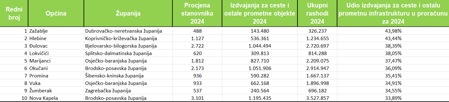 Po stanovniku je najviše za ceste i ostalu prometnu infrastrukturu u 2024. godini izdvojila Općina Mrkopalj (994 eura), Kalinovac 740 eura, Vuka 710 eura, Promina 631 euro, Saborsko 620 eura, Civljane 524 eura, Lokvičići 500 eura, Podravske Sesvete 485 eura, Okučani 484 eura i Jasenovac 482 eura.