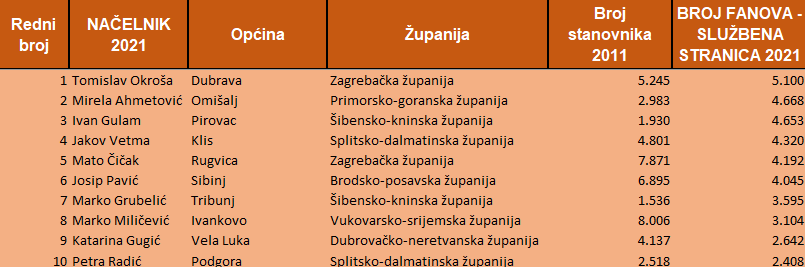 Gledajući, pak, apsolutne brojke, najviše pratitelja ima Tomislav Okroša, Mirela Ahmetović, Ivan Gulam, Jakov Vetma iz Općine Klis (Splitsko-dalmatinska županija), Mato Čičak iz Rugvice (Zagrebačka županija), Josip Pavić iz Općine Sibinj (Brodsko-posavska županija), Marko Grubelić iz Tribunja (Šibensko-kninska županija), Marko Miličević iz Općine Ivankovo (Vukovarsko-srijemska županija), Katarina Gugić iz Općine Vela Luka (Dubrovačko-neretvanska županija)m te Petra Radić iz Podgore. (P.L., M.P.D.)