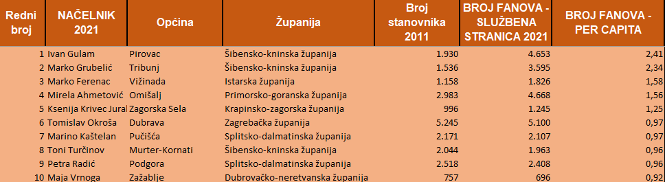 Gledajući broj pratitelja per capita, najpopularniji su načelnici dviju općina iz Šibensko-kninske županije, Pirovac i Tribunj, koji obojica imaju i više nego dvostruko fanova nego što njihove općine imaju stanovnika. Ivan Gulam iz Pirovca u trenutku naše provjere je tako imao 2,41 fanova po stanovniku (4.653), a Marko Grubelić iz Tribunja 2,34 pratitelja po stanovniku (3,595 u apsolutnim brojkama).