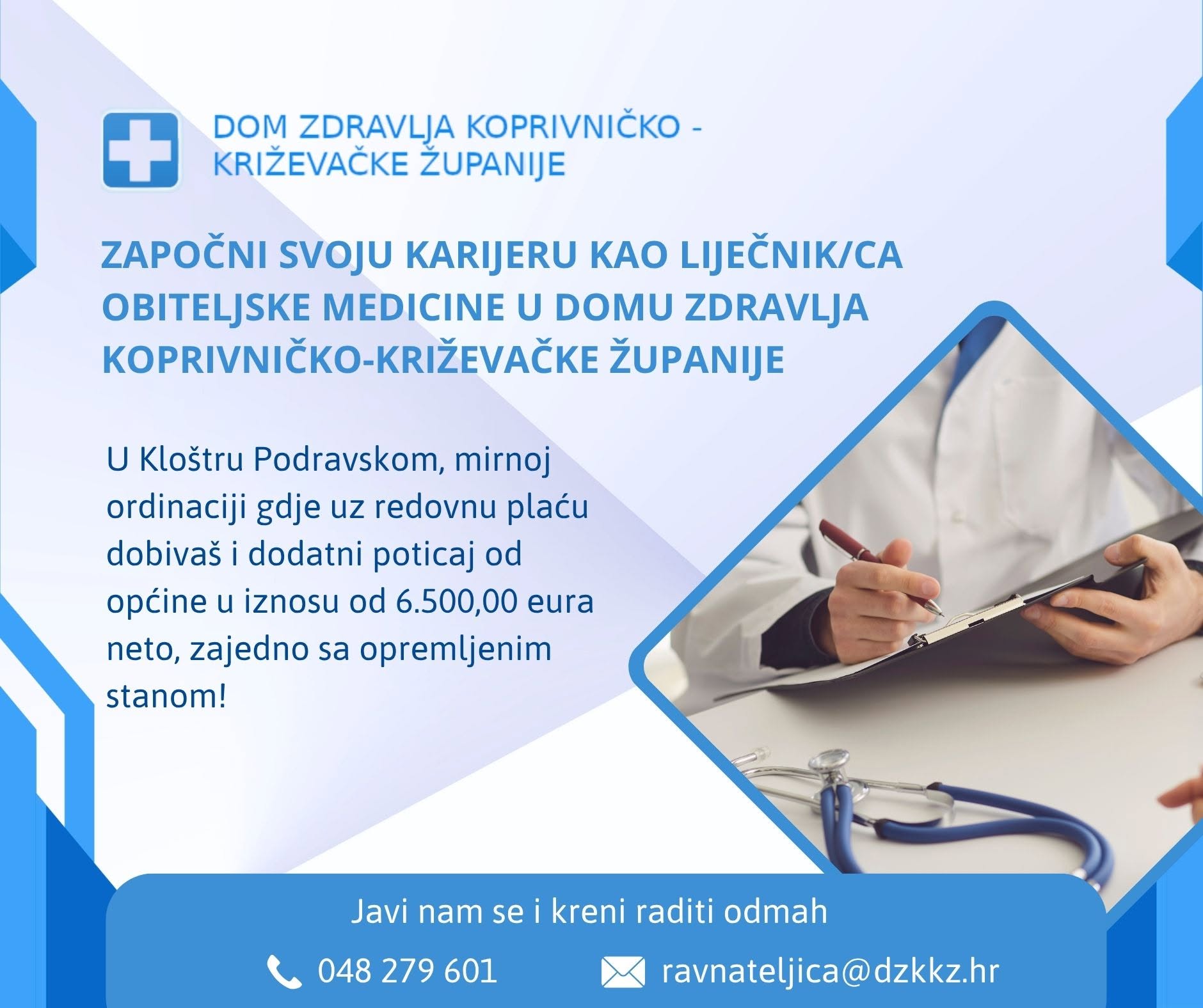 Odnedavno je ordinacija opće/obiteljske medicine u Kloštru Podravskom opet u potrazi za novim liječnikom ili naravno liječnicom s obzirom da je dosadašnja otišla na daljnju specijalizaciju iz Kloštra.