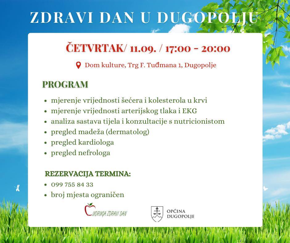 Općina Dugopolje nastavlja s provođenjem javnozdravstvene akcije „Zdravi dan u Dugopolju“. U četvrtak, 11. rujna, u Domu kulture građani su tako mogli obaviti besplatne preglede dermatologa, kardiologa, nefrologa i nutricionista.