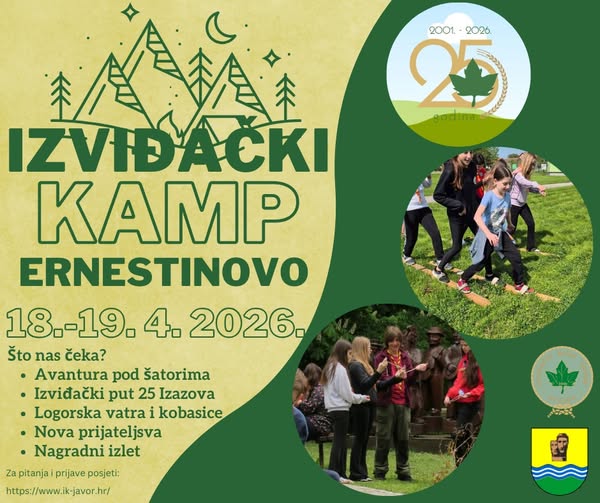 Općina Ernestinovo i Izviđački klub Javor Osijek i ove godine organiziraju Izviđački kamp za djecu i mlade, koji će se održati 18. i 19. travnja u Parku skulptura u Ernestinovu, povodom Dana planeta Zemlje.