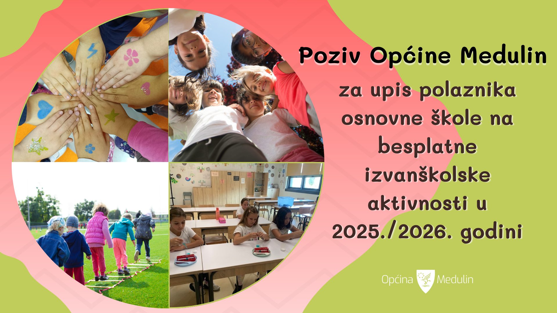 Općina Medulin poziva sve zainteresirane roditelje, zakonske zastupnike/staratelje da upišu djecu, polaznike osnovne škole, s prebivalištem na području općine Medulin, na besplatne izvanškolske aktivnosti koje će financirati Općina Medulin. Besplatne aktivnosti će se provoditi u 2025. i 2026. godini.