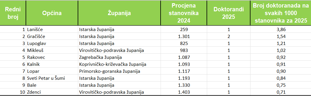 U odnosu na broj stanovnika, najveći broj novih doktoranada je iz tri istarske općine – Lanišća (3,86 doktora znanosti na 1.000 stanovnika), Gračišća (1,54 doktora znanosti) i Lupoglava (1,21 doktor znanost na 1.000 stanovnika. Iz Mikleuša je riječ o 1,02 doktoranda na 1.000 stanovnika, Rakovca 0,92, Kalnika 0,91, Lopara 0,90, Svetog Petra u Šumi 0,84, Bala 0,75 i Zdenca 0,71 novi doktor znananosti na 1.000 stanovnika.